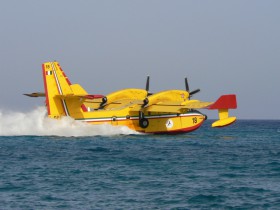 Požární hydroplán v akci při hašení požáru v Guardavalle v Itálii.